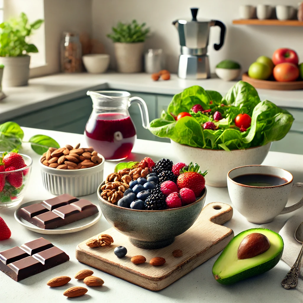 - 특히 베리류(블루베리, 아사이베리, 라즈베리)는 높은 폴리페놀 함량을 자랑하며, 노화로 인한 세포 손상을 방지하는 데 도움을 줍니다.